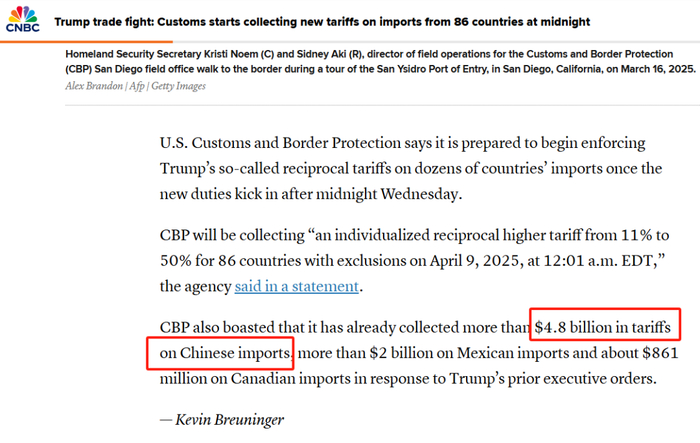 CBP 还提到说,针对特朗普之前的行政命令,它已经对中国进口商品征收了超过 48 亿美元的关税,对墨西哥进口商品征收了超过 20 亿美元的关税,对加拿大进口商品征收了约 8.61 亿美元的关税。(消息源:CNBC)