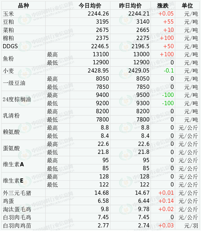豆粕现货:今日全国油厂及贸易商43%蛋白豆粕价格普遍上涨,其中盘锦油厂3300元/吨,涨20元/吨;天津贸易商3340元/吨,涨30元/吨;青岛油厂3260元/吨;泰州油厂3180元/吨,涨30元/吨;泉州油厂3180元/吨,涨30元/吨;东莞外资油厂3080元/吨,涨10元/吨;北海油厂3100元/吨,涨70元/吨;周口油厂3320元/吨,涨20元/吨;眉山油厂3430元/吨,涨30元/吨。