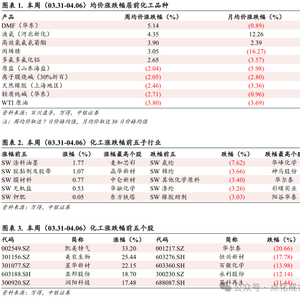 • 本周(03.31-04.06)均价跟踪的100个化工品种中,共有29个品种价格上涨,40个品种价格下跌,31个品种价格稳定。跟踪的产品中29%的产品月均价环比上涨,40%的产品月均价环比下跌,另外31%产品价格持平。周均价涨幅居前的品种分别是DMF(华东)、液氨(河北新化)、高效氯氟氰菊酯、丙烯腈、多氟多氟化铝;而周均价跌幅居前的品种分别是WTI原油、轻质纯碱(华东)、天然橡胶(上海地区)、离子膜烧碱(30%折百)、原盐(山东海盐)。
