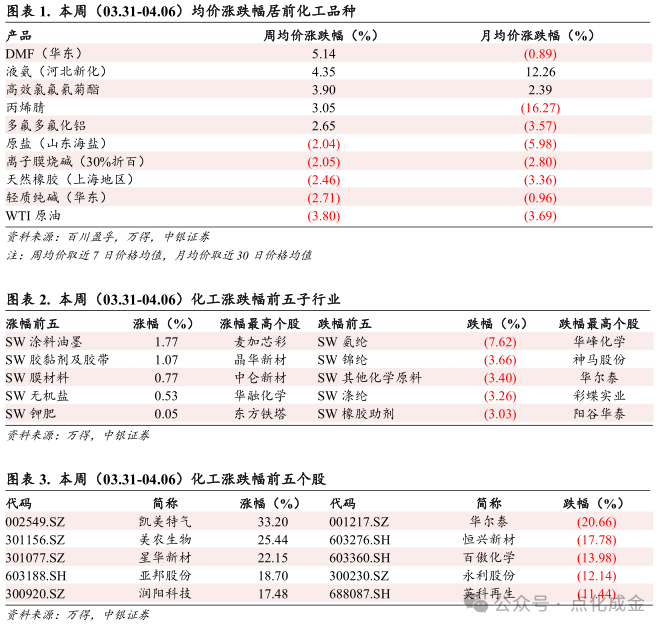 本周(03.31-04.06)均价跟踪的100个化工品种中,共有29个品种价格上涨,40个品种价格下跌,31个品种价格稳定。跟踪的产品中29%的产品月均价环比上涨,40%的产品月均价环比下跌,另外31%产品价格持平。周均价涨幅居前的品种分别是DMF(华东)、液氨(河北新化)、高效氯氟氰菊酯、丙烯腈、多氟多氟化铝;而周均价跌幅居前的品种分别是WTI原油、轻质纯碱(华东)、天然橡胶(上海地区)、离子膜烧碱(30%折百)、原盐(山东海盐)。