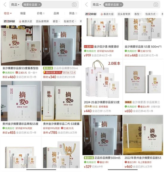 电商平台上的售价更低。在拼多多上,摘要珍品的价格区间跨度非常大,金沙酒水旗舰店售价650元/瓶,其他店铺有卖440元的,也有卖450元的,甚至还有酒商卖329元/瓶。