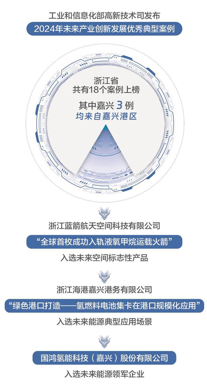 日前,工业和信息化部高新技术司发布了2024年未来产业创新发展优秀典型案例,浙江省共有18个案例上榜,其中嘉兴3例,全部来自嘉兴港区,涉及商业航天和氢能领域的标志性产品、领军企业、典型应用场景多个类别。