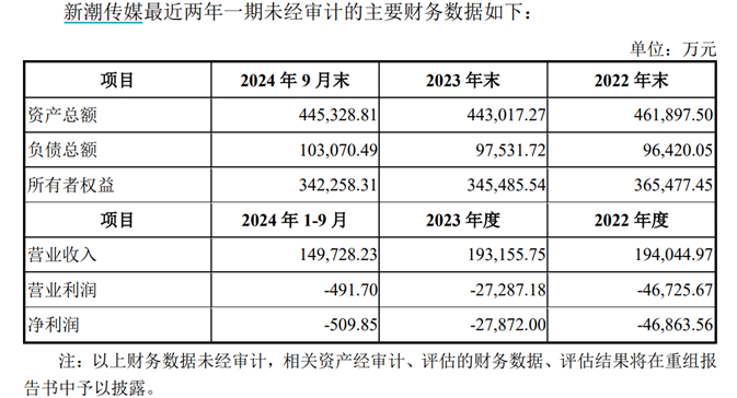 从最近两年一期未经审计的财务数据来看,新潮传媒2022年度、2023年度、2024年前三季度分别实现营业收入19.40亿元、19.32亿元和14.97亿元,净利润分别为-4.69亿元、-2.79亿元、-510万元,亏损幅度在逐渐缩窄。截至2024年9月末,新潮传媒总资产为44.53亿元,净资产34.23亿元。