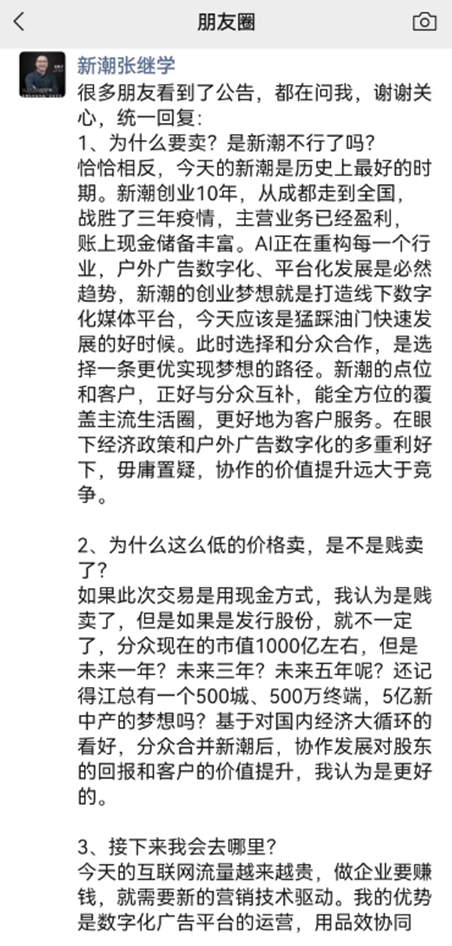 新潮传媒董事长、总经理同时也是本次主要交易对方之一的张继学,在微信朋友圈发文回答了三个关键问题: