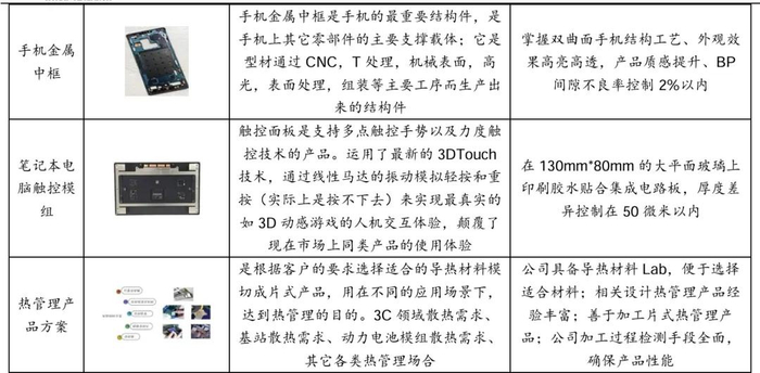 1)散热产品:公司已经具备热管、均热板等散热零部件、空冷散热模组、水冷模组、石墨片、导热垫片、导热胶相关产品的研发、生产能力及系统性散热解决方案。公司不锈钢超薄VC均热板及散热解决方案被多款中高端手机机型搭载并实现量产出货。