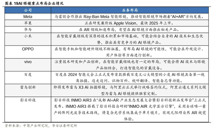 主流硬件厂商产品持续迭代,众科技巨头纷纷布局。2024年包括Rokid、Snap、Meta、百度、Looktech、雷鸟创新、闪电科技、XREAL等品牌都发布了智能眼镜相关产品。同时,三星、OPPO、vivo、华为、腾讯、字节跳动等科技巨头也在积极布局AI眼镜项目。