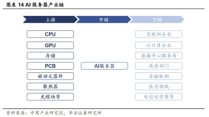 在AI服务器需求急剧上升的推动下,带动AI服务器产业链上下游收入扩张。AI服务器产业链上游为零部件,包括CPU、GPU、存储芯片、固态硬盘、PCB、被动元器件、散热器等;中游为AI服务器;下游为各类应用市场,包括互联网企业、云计算企业、数据中心服务商、政府部门、金融机构、医疗领域、电信运营商等。