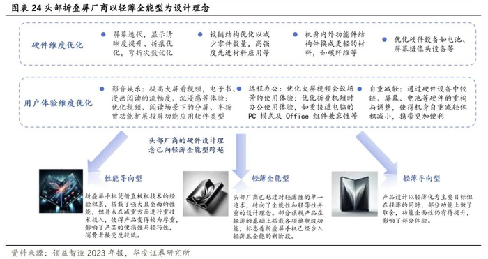 碳纤维结构件助力折叠屏手机实现轻薄化。当前手机厂商对折叠屏的设计理念主要分为性能导向型、轻薄导向型和轻薄全能型。国内头部厂商已经跨越了单一的轻薄阶段,在折叠屏手机中加入了更多的旗舰功能,产品设计开始向轻薄全能型的方向发展,并将成为未来发展的主要趋势。碳纤维复合材料由于自身的高强度、低密度、高模量等优异性能,对于解决当前折叠屏手机面临的折叠后的厚度以及铰链的耐用度、折痕等市场普遍关注的问题拥有天然优势。