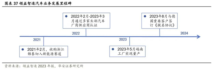 公司凭借领先的精密制造、研发设计和商务拓展能力,在动力电池结构件细分领域中迅速崛起,以高标准产品成为北美新能源大客户的重要供应商。2023年8月公司子公司与德国某整车厂商旗下动力电池子公司签订了《提名协议》,为其供应动力电池盖板、模切件以及相关注塑、冲压件,协议的顺利履行预计将累计增加公司2025年至2029年收入约人民币22亿元。公司正积极拓展汽车其他相关产品线,如汽车散热模组、充电产品和车载充电机等。公司目前已布局动力电池电芯铝壳、盖板、转接片等电池结构件产品及柔性软连接、注塑件等其他汽车相关精密结构件,在精密制造、研发设计能力等方面具备竞争优势。