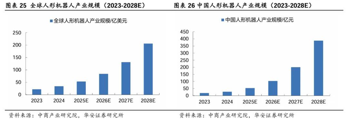 人形机器人集成人工智能、高端制造、新材料等先进技术,有望成为继计算机、智能手机、新能源汽车后的颠覆性产品。随着人工智能技术的逐步成熟和机器人产业的快速发展,全球人形机器人行业发展进入黄金时期,市场规模呈现持续增长态势。根据中商产业研究院数据,2023-2028年,全球人形机器人产业规模将由22亿美元增至206亿美元,年复合增长率达57%;中国人形机器人产业规模将由18亿元增至387亿元,年复合增长率高达85%。