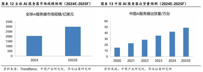 受益云侧AI算力需求扩张,用于提供高容量、高性能数据存储和处理服务的超大型数据中心加速落成,AI服务器市场景气度有望持续攀升。根据Trendforce及中商产业研究院数据,2024年全球服务器行业的总价值将达到3060亿美元,其中,与AI服务器相关的行业价值估计约为2050亿美元;由于需求持续旺盛且产品平均售价较高,预计2025年AI服务器细分市场的价值将提升至2980亿美元,占全球服务器行业总价值的70%以上。从中国市场看,2020-2025年中国AI服务器出货量由15万台增至约50万台,年复合增长率高达27%。