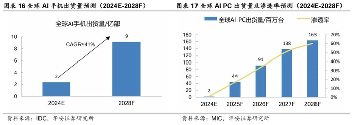 1)AI手机/AI PC:随着各大手机将生成式AI能力作为中高端产品升级的重点,智能手机产业链上下游从软硬件等各方面提供支持,AI手机有望加速渗透。根据IDC预测,2024年全球AI手机出货量达2.3亿部,渗透率约19%;到2028年,全球AI手机出货量将达9.1亿部,4年CAGR达41%。随着各大处理器供应商的AI PC规划逐步推进,众多AI PC上市或推动PC换机周期到来。根据MIC预测,2028年AI PC出货量将达1.6亿台,渗透率达60%,24-28年复合增长率高达200%。