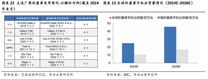 折叠屏手机凭借其较高的技术门槛及高附加值属性成为目前智能手机市场新的增长点及重要发展机遇。截至2024年8月,除苹果外,各主流厂商折叠屏手机产品迭代均已达到至少3款,且机型性能参数不断提升。根据IDC预测,2024-2028年,全球折叠屏手机出货量将由2500万台增至4570万台,年复合增长率达16%;中国折叠屏手机出货量将由1070万台增至1730万台,年复合增长率达13%。