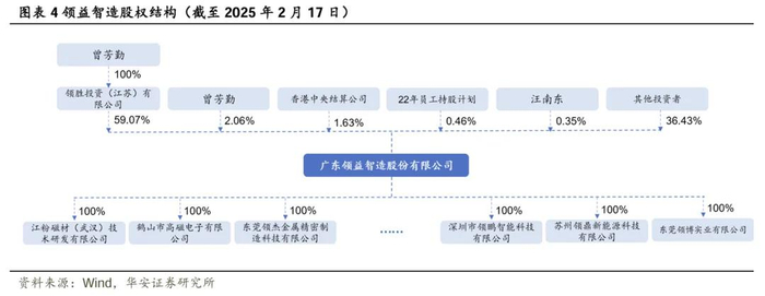 公司股权结构和组织架构稳定。截至2025年2月17号,领胜投资公司以59.07%的股份成为公司控股股东。公司创始人曾芳勤通过间接持股领胜投资、以及直接持股2.06%的方式,共持有公司61.13%的股份,成为公司实控人。在公司其余股东中,香港中央结算公司、22年员工持股计划、汪南东分别持股1.63%、0.46%、0.35%,其他投资者股份占比达36.43%。