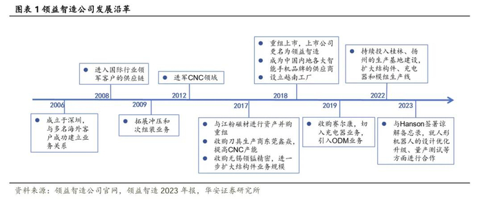 领益智造前身为领益科技,2006年成立于广东深圳,2017年与江粉磁材进行资产并购,2018年重组上市更名为领益智造。成立十余年来,公司深耕精密制造行业,先后并购了东莞鑫焱、领镒精密、赛尔康等公司强化产业链地位,其精密功能件产品市场份额及出货量已连续多年稳居全球消费电子市场领先地位,产品自消费电子市场进一步渗透新能源汽车、光伏、储能等新兴领域。