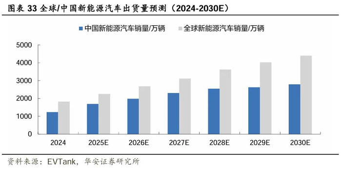 全球新能源汽车市场持续稳健增长。EVTank数据显示,2024年全球新能源汽车销量达到1,824万辆,同比增长24%。2024年中国新能源汽车销量达到1,287万辆,同比增长36%,占全球销量比重提升至71%。EVTank预计2025年全球新能源汽车销量将达到2,240万辆,其中中国将达到1650万辆,2030年全球新能源汽车销量有望达到4405万辆。