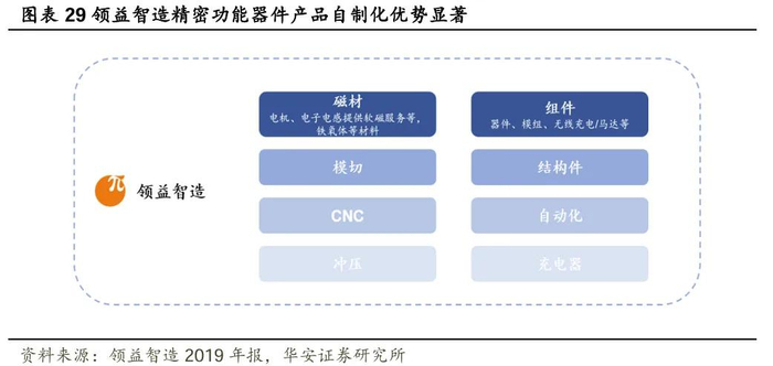 公司在精密功能件生产优势显著。精密功能器件行业解决了上游材料厂商的标准化生产和下游消费电子产品整机代工厂和组件生产商需求多样化、定制化之间的矛盾,产品具有高定制化、高自动化程度和高精密程度的特点。领益智造具有较大的生产规模和较强的持续供货能力,能及时满足单个客户对不同型号产品和众多客户的订单需求,在精密模具开发、核心生产技术、新产品研发和工艺创新等方面均取得相应成果。近年来持续向上下游延伸,上游通过并购江粉磁材,下游通过小件的积累逐步切入模组和组装,实现了多数产品自制化的优势。
