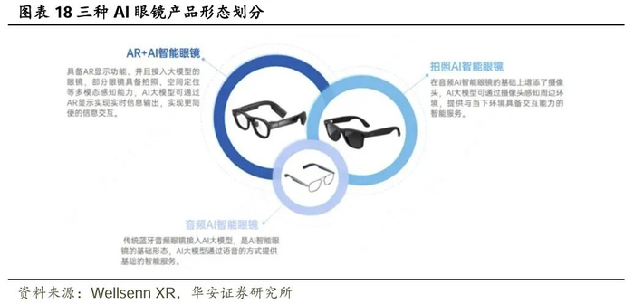 2)AI眼镜: AI眼镜通过集成芯片、传感器和软件系统,实现了信息处理、环境感知和智能服务等功能。它们可以将信息直接投射在镜片上,提供导航、商品识别、运动监测和语音通信等功能。这些功能使得AI眼镜在日常生活和工作中具有广泛的应用场景,满足了用户对于智能穿戴设备的需求。AI眼镜产品形态共三种:音频AI智能眼镜、拍照AI智能眼镜和AR+AI智能眼镜。
