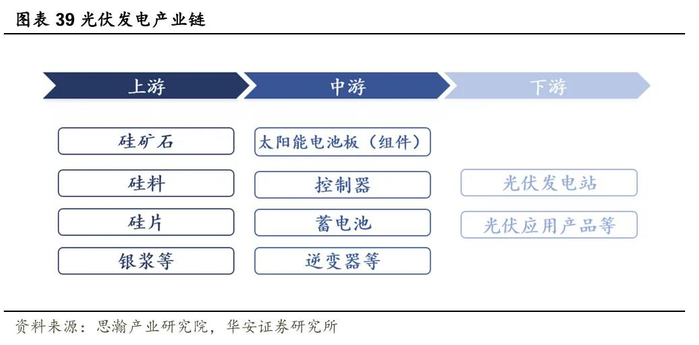 光伏发电产业链上游为原材料,包括硅矿石、硅料、硅片、银浆等;产业链中游为光伏发电系统,主要由太阳能电池板(组件)、控制器、蓄电池组(可无)、逆变器等设备组成,其中太阳能电池板由电池片和电池组件组成;产业链下游则是光伏发电站以及光伏应用产品。