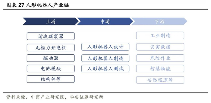 人形机器人产业链上游为零部件供应,核心零部件包括谐波减速器、无框力矩电机、空心杯电机、行星滚柱丝杠、编码器、传感器、轴承、结构件等;中游为人形机器人的设计、制造和测试过程;下游应用领域包括工业制造、灾害救援、危险作业、智慧物流、安防巡逻、服务娱乐等。