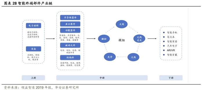 智能终端部件生产厂商主要可以分为电子部件厂商、机电部件厂商、结构件部件厂商及功能器件厂商四大类。1)电子部件厂商:主要提供芯片、存储器、音频功放、电阻、电容、连接器等;2)机电部件厂商:主要提供智能终端中既与电子相关又与结构相关的物料,包括屏幕、摄像头、喇叭、马达、柔性线路板等;3)结构部件厂商:主要提供高尺寸精度、高表面质量、高性能要求的起保护和支承作用的、与终端尺寸、结构外观相关的塑胶或五金部件;4)功能器件厂商:主要提供各类实现特定功能的产品,包括紧固件、密封、导热、缓冲、绝缘、屏蔽、标签、按键等。
