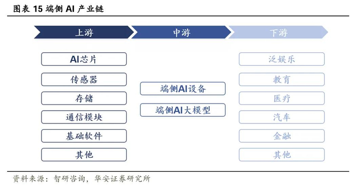 端侧AI,是指在终端设备上直接运行和处理人工智能算法,允许终端设备在本地处理数据,不需要将数据发送到云端或服务器进行处理的应用。相较于依赖数据中心并在云服务器上运行的云端AI,端侧AI以其综合成本低廉、本地可靠性高、隐私保护性强以及个性化服务突出等优势而备受瞩目。产业链来看,端侧AI上游市场主体为核心技术与硬件提供商,负责提供数据、算法框架、AI芯片、传感器、处理器等硬件和软件;中游则是端侧AI集成环节,主要包括系统集成(端侧AI设备)与平台服务(端侧AI大模型);下游为应用领域,包括但不限于智慧安防、车载终端、智能手机等。