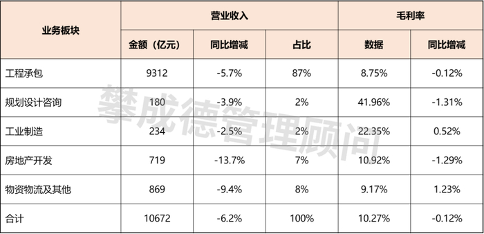 规划设计咨询板块的基本经营模式是通过市场竞争,按照合同约定完成工程项目的设计咨询及相关服务,同时发挥产业优势,运作设计总承包项目和工程总承包项目。2024年,该板块新签合同额205亿元,同比减少31%,降幅较大的主要原因是受市场营销,规划设计咨询项目招标总量减少;利润总额37亿元,同比下降6.8%。