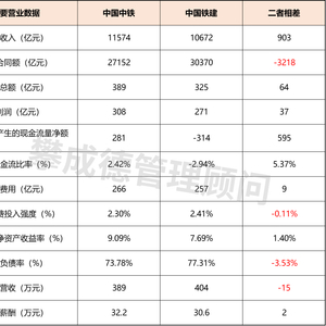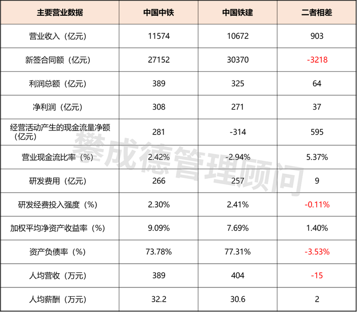 中国铁建在新签合同额、研发经费投入强度、人均营收等方面超过中国中铁。