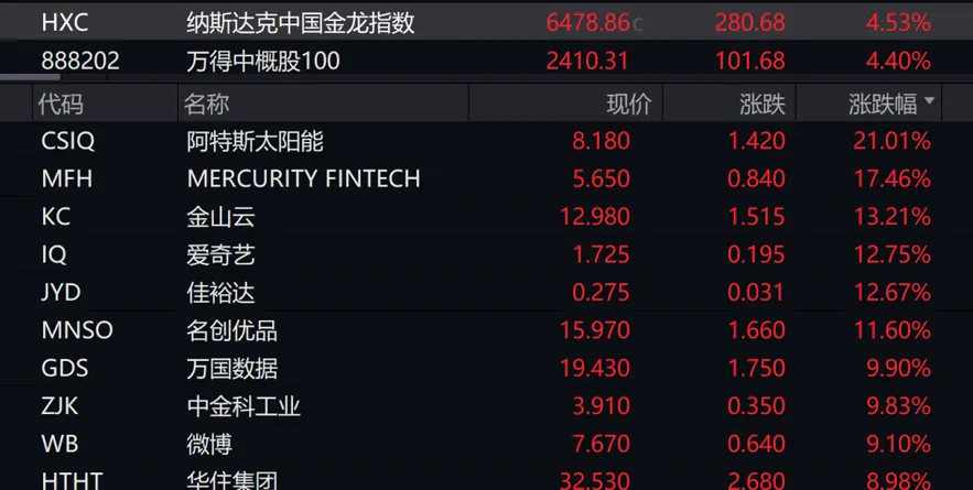 纳斯达克中国金龙指数收盘涨4.53%。热门中概股集体走高,理想汽车、哔哩哔哩、京东、小鹏汽车涨超6%,阿里巴巴、蔚来涨超5%,百度涨超4%。