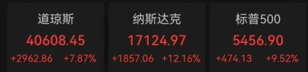 截至收盘,纳指涨12.16%,为2001年1月3日以来最大单日百分比涨幅,第二大纪录涨幅;标普500指数涨9.52%,录得2008年10月28日以来最大单日百分比涨幅;道指大涨超2900点,涨幅达7.87%。