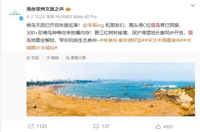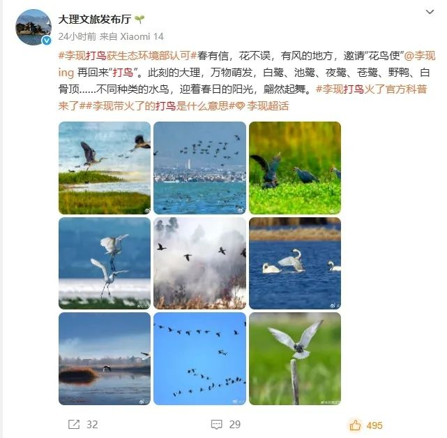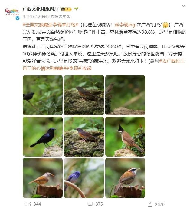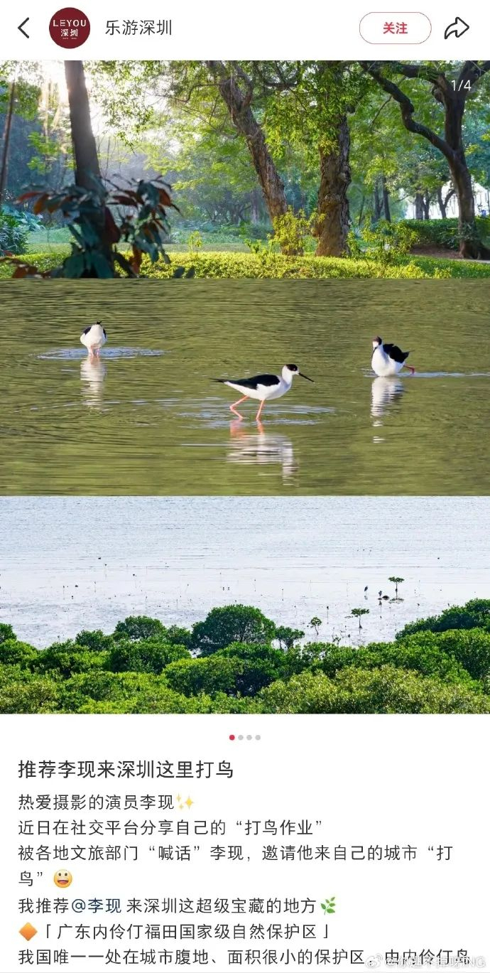 当明星效应从商业代言转向倡导生态保护,公众人物的社会价值得到重新定义。而多地文旅部门的联动更是进一步彰显了李现“打鸟”的社会价值。多地官微的“喊话”行为,实质上是生态旅游转型的积极探索。明星参与生态活动不仅可以吸引游客关注本地自然资源,也能够通过流量效应推动地方生态保护。