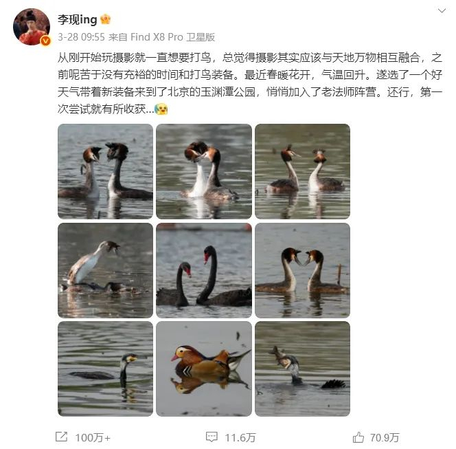 李现“打鸟”这一跨界传播事件的影响不容小觑。据统计,其分享的鸟类摄影作品受到超过10万网友点赞,玉渊潭公园的观鸟线路成为春季热门打卡点。这种“明星效应+生态传播”模式,成功地将原本小众的观鸟文化推向大众视野。当李现的微博从精修写真变为鸟类生态图鉴,当《川西雪山组图》获得《国家地理》杂志编辑点赞,他正以“护鸟使者”的形象,重构着明星与公众的互动范式。