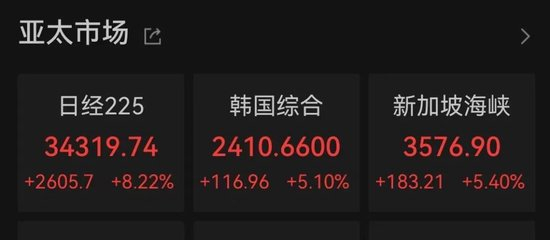 亚太市场全线走高,截至发稿,MSCI亚太指数上涨5%。日经225指数涨超8%,韩国综合指数涨超5%,新加坡海峡指数涨超5%,澳洲标普200涨近5%。