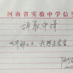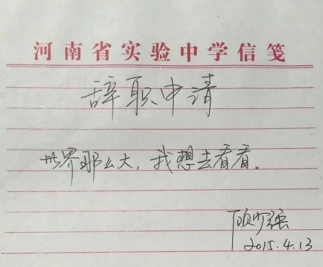 2015年4月,中学教师顾少强的一封辞职信引发热评,辞职的理由仅有10个字:“世界那么大,我想去看看。”