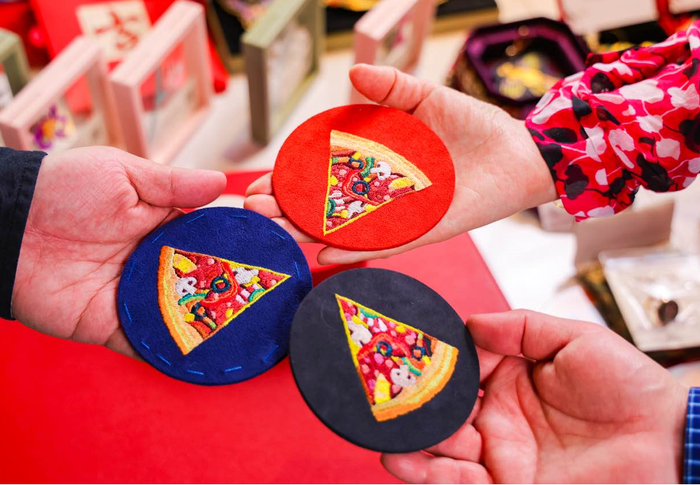 近日,东直门必胜客餐厅化身“非遗工坊”,意式香肠、什锦鲜蔬、焦黄芝士等经典元素被非遗京绣传承人精彩呈现在丝绒质地的杯垫上,只见她用手中三寸银针编织着千丝万缕,古老的刺绣技艺与西式餐饮文化完美嫁接。