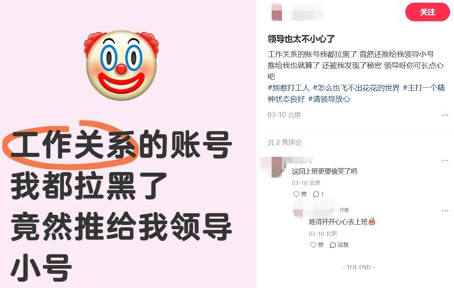 比如有人惊恐地发现,小红书给他推荐了刚刚换工作的前同事,甚至是几个月前在咖啡店偶遇的甲方经理;有人默默换了个小号,想在小红书上做一个安静的冲浪选手,结果没几天,首页就开始推送公司的下午茶团购和部门同事的旅行笔记。