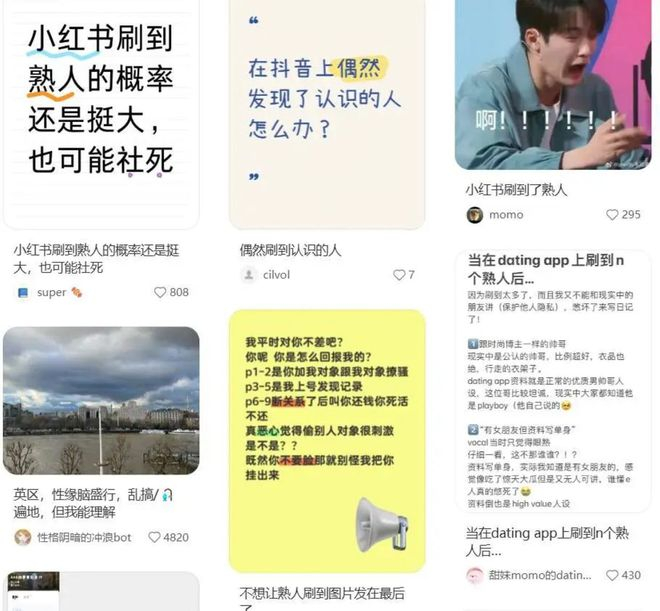 频繁调用你的地理信息之下,从未在社交软件上产生交集的人,会被小红书悄悄归为“潜在熟人”,于是你们的笔记开始互相出现在对方的首页,社死的尺度是多样的——既不致命,又让人无处遁形。