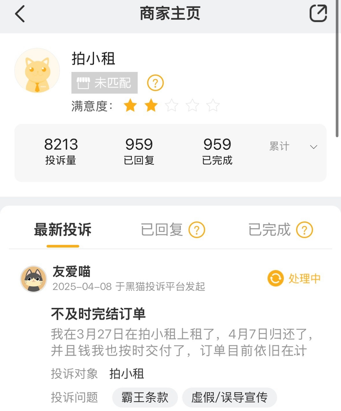 截至4月8日,“拍小租”在黑猫投诉平台总投诉量8213条