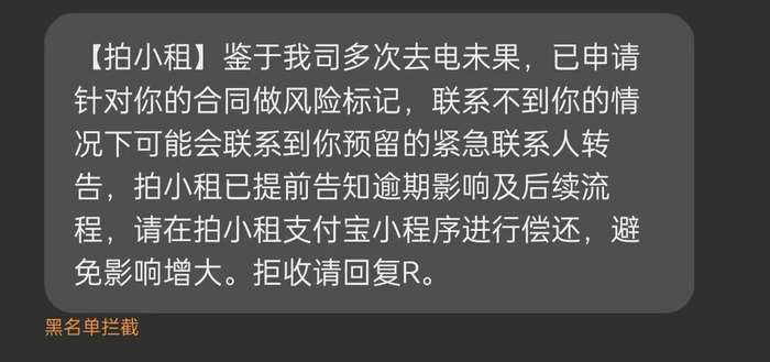 “拍小租”发给张芳的催贷短信