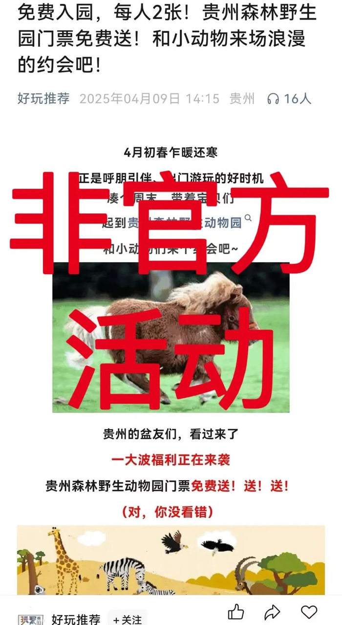 近期,部分自媒体账号在网络平台发布“贵州森林野生动物园门票免费送”相关活动,引发舆论关注。