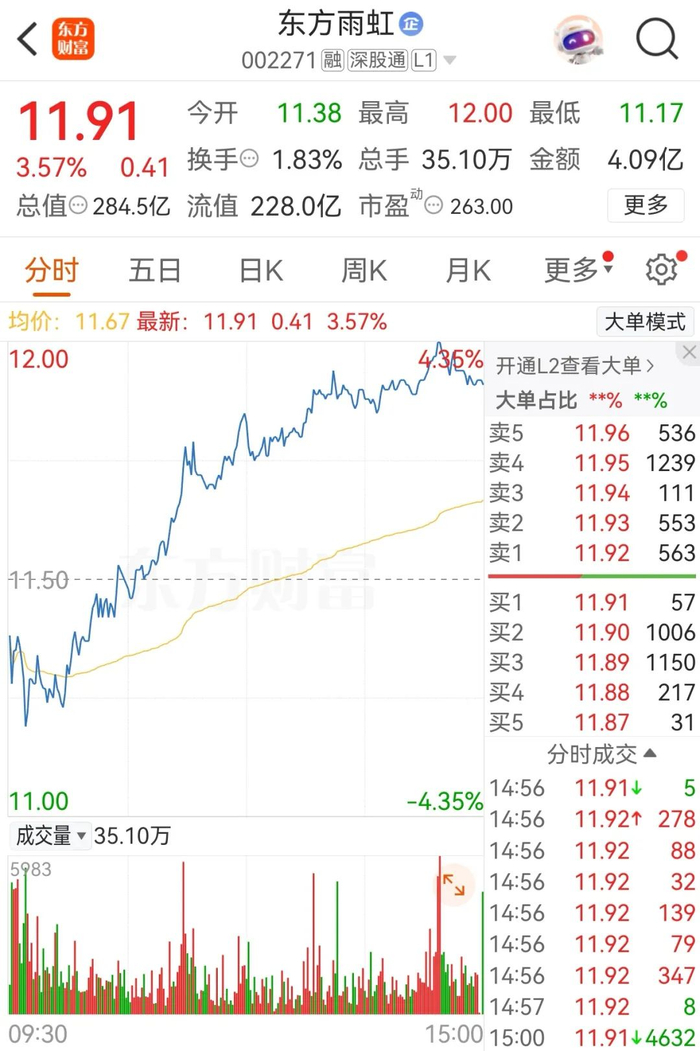 在4月9日的交易中,三棵树市值首次超过东方雨虹,引发市场关注。截至收盘,三棵树股价上涨4.27%至54.18元,总市值达285.5亿元,而东方雨虹股价则上涨3.57%至11.91元,市值为284.5亿元。这一变化标志着自2016年6月3日以来,三棵树首次在市值上超越了东方雨虹,不过两家公司总市值相差不大。