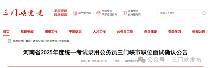(三)三门峡党建网为河南省2025年统一考试录用公务员三门峡市专用网站,有关面试、体检、考察、录用等工作安排均通过上述网站公布,不再通过其他方式通知应试者,因未及时关注专用网站而造成的一切后果,由考生本人承担。