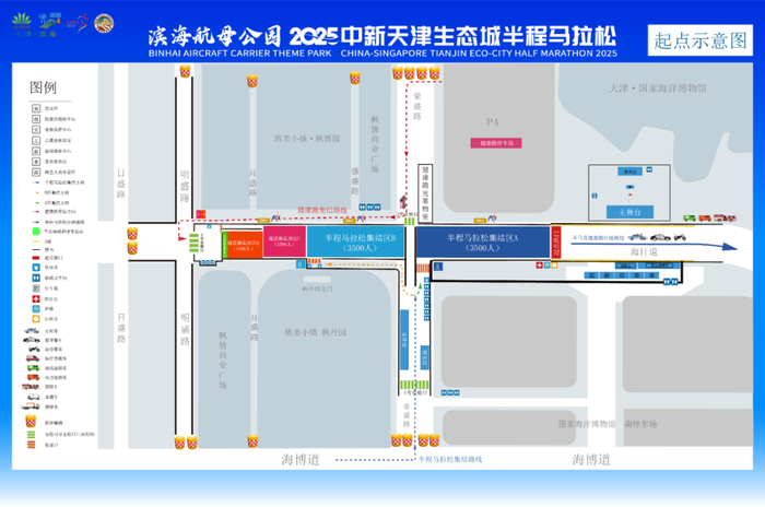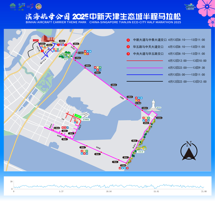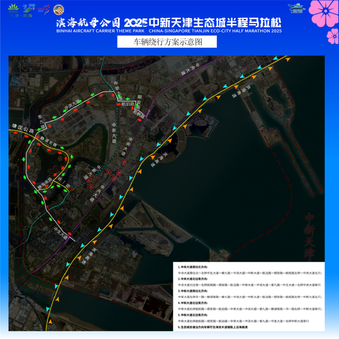 4月13日(星期日)早5:30-中午12:00期间,比赛途经的海轩道、弘通路、海旭道、东堤路、中泰大道等赛道路段和中新大道、中央大道等主要通道及其周边路段的通行将受到影响。