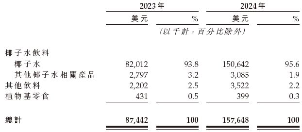 香港椰子水饮料市场第一。公司自2016年起在香港椰子水相关市场连续九年蝉联榜首,2024年市场占有率约60%,超越第二大竞争对手七倍以上。