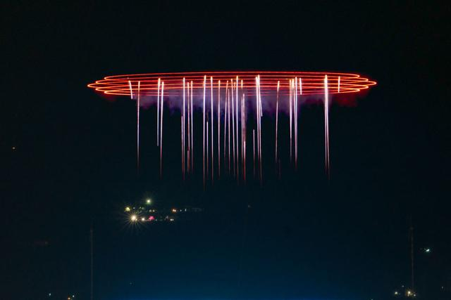 在长沙浏阳市天空剧院拍摄的一场“烟花+无人机”表演(2024年12月7日摄)。近年来,浏阳烟花产业不断创新升级,科技赋能加上文化加持,带动烟花产业整体焕发新生。