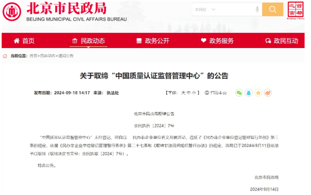 此外,还有“315品质诚信示范品牌”“中国消费者可信赖品牌”等6块荣誉证书或牌匾,颁发机构涉及中国质量管理发展协会、全国企业发展研究中心、中国质量认证监督管理中心。经记者查询,中国质量管理发展协会、全国企业发展研究中心均未在民政部门登记;北京市民政局于2024年9月14日下发公告【京民执告(2024)7号】,对中国质量认证监督管理中心予以取缔。