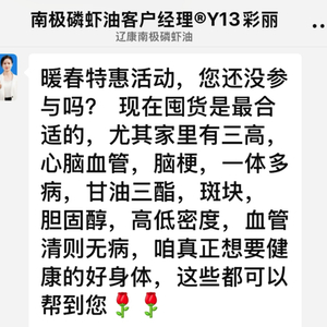 李先生添加了其中一个“彩丽”的微信。根据李先生提供的与“彩丽”的微信聊天截图,记者看到其向李先生推销辽康南极磷虾油产品时,宣称该产品对维护心脑血管健康、保护视力记忆力等有作用。此外,“彩丽”还将自己与其他一些消费者的微信聊天截屏发送给李先生,以证明辽康南极磷虾油的作用。