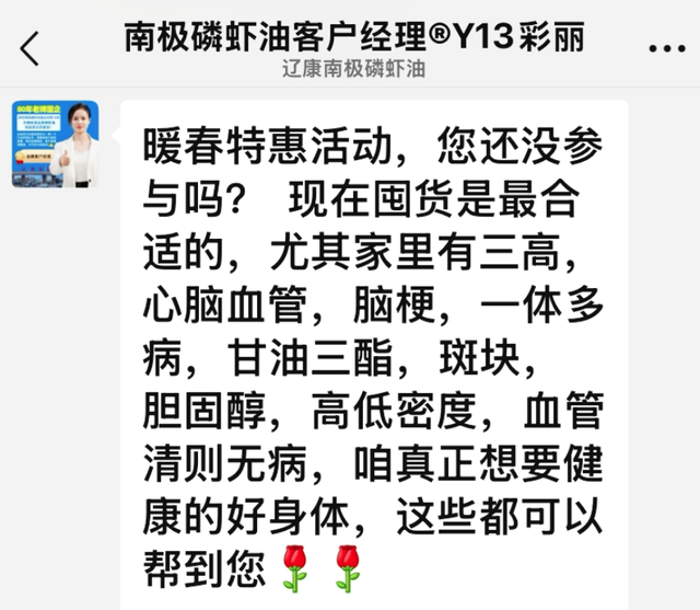 4月4日上午,长春市消费者尤先生情绪激动地告诉记者,他患有高血压,在微信朋友圈看到辽康南极磷虾油的宣传后很心动,便加了微信网友“南极磷虾油客户经理”的微信。几天来,该客户经理开始“狂轰滥炸”,多次向他推销这款产品,声称对高血压有非常好的功效。最后,他花了2100元钱购买了10瓶,收到后打开包装仔细查看产品说明书才发现该产品只是普通食品。