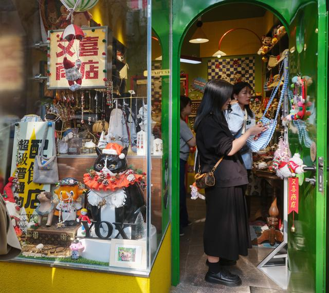 “巨富长”街区的“腔调”,离不开星罗棋布的个性小店。如果说街区是城市的“毛细血管”,这些小店就如同一个个细胞,塑造了整个街区的品质与调性。在富民路上,记者偶遇了两位29岁的年轻女孩。她们家住闵行区,当天从常熟路地铁站下来,自长乐路开始一路探索“巨富长”的街边小店,逛了1个多小时,在一家古着店花费600余元淘到了衬衫和帽子,又在又喜商店购入了一条128元的手链。“相比于上海的其他街区,扎根在‘巨富长’的品牌个性更加鲜明,风格也更加多元,尤其适合‘潮人’。”