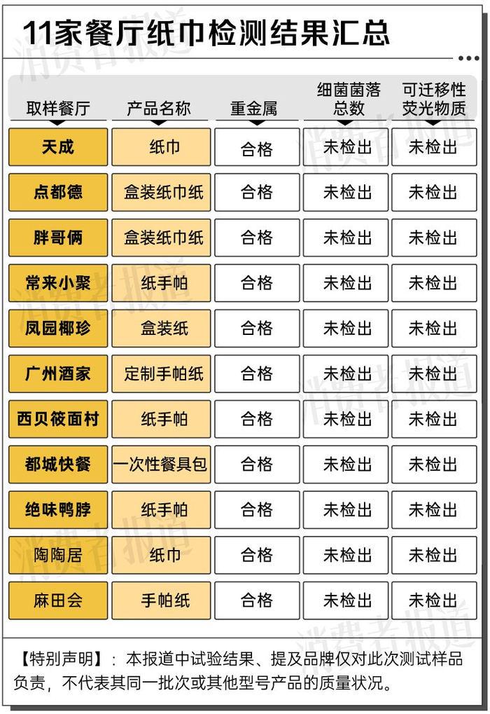 检测显示,此次在11家餐厅取样的一次性纸巾样品(样品状态:密闭包装)全部合格。